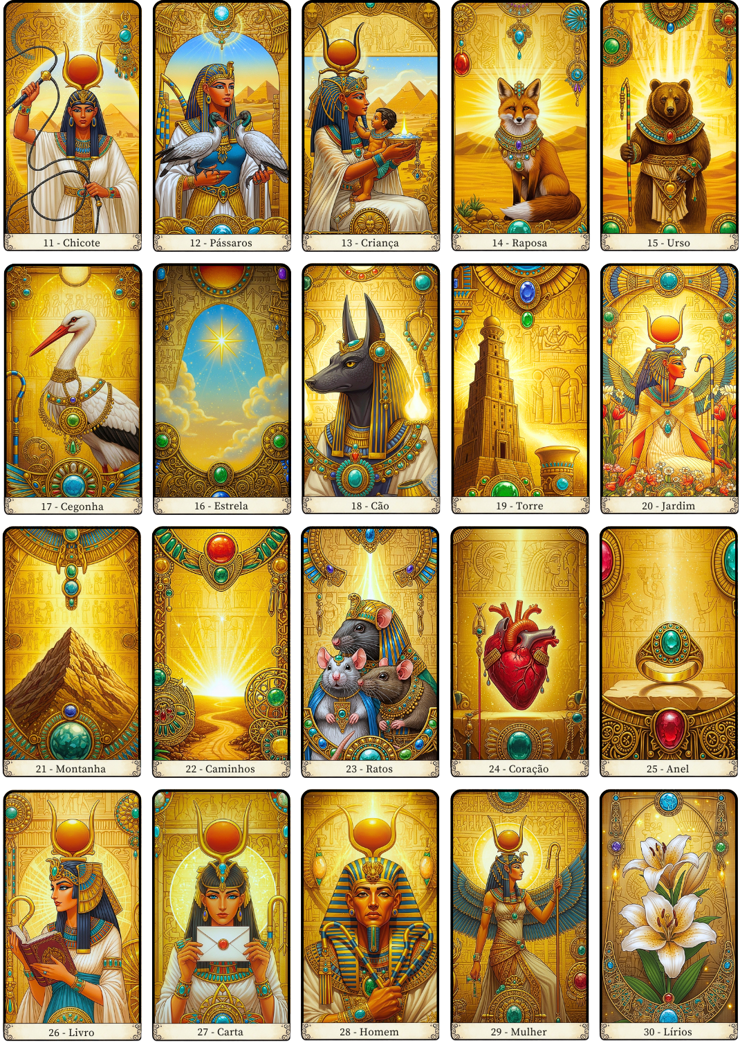 Fabricado em Papel Glossy Premium, este baralho possui um acabamento plastificado que garante durabilidade e brilho, tornando suas leituras ainda mais impressionantes. As ilustrações, inspiradas na temática egípcia, convidam você a explorar o simbolismo profundo que cada carta possui.