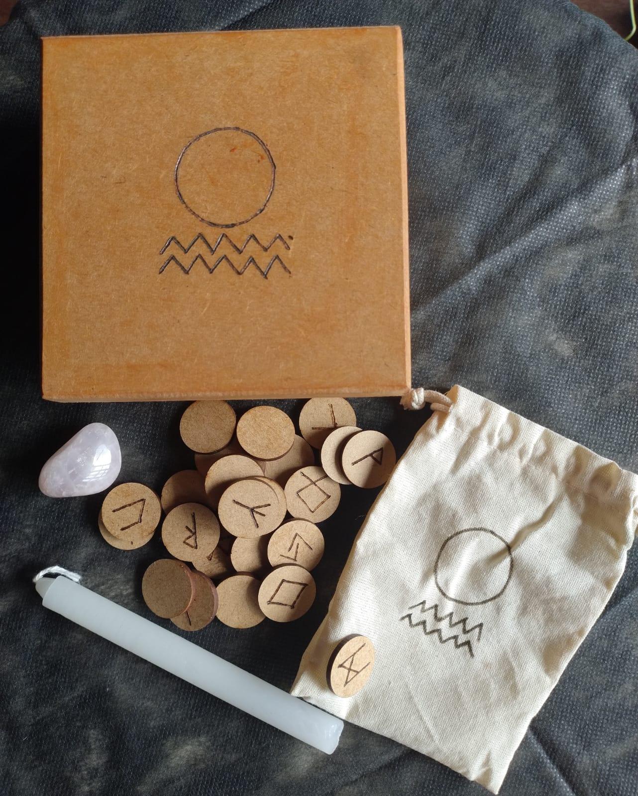 25 peças de mdf com os símbolos rúnicos gravados.